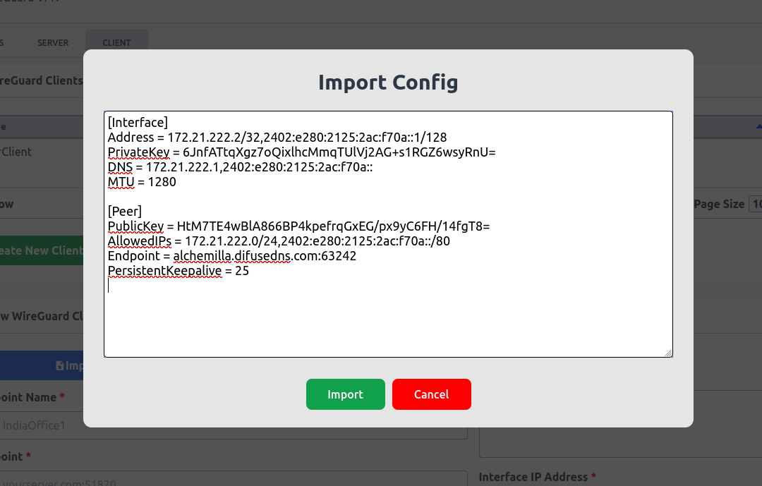The first thing that you’ll need to do is go into the Clients tab of the WireGuard page and click on the "Create New Client" button, you will be greeted with a form that has a lot of inputs, now you can either fill in the form yourself or you can import a configuration that you you or your provider has generated.